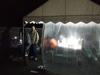 この季節、風に負けないテントと周りをかこうシートは必須。