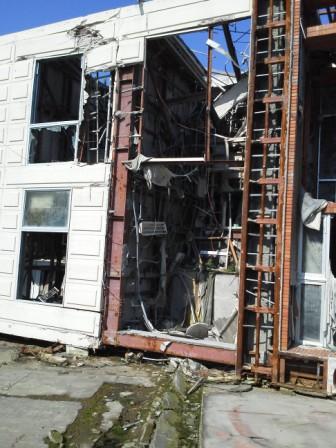 建物がほとんど撤去された中、横倒しのビルがぽつんと残っていました。