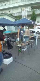 集会場前にタープを張って焼き鳥や牛タン、ウインナーなどを焼き、もつ煮込みラーメンも作っていきます。