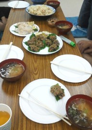 朝もやが残る中、お母さんが朝食を作ってきてくれました。アジのたたき、お味噌汁、おしんこ、炊き込みごはん。美味しかったなぁ。