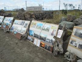 仙台の沿岸部のお寺の境内での写真展。たまたま「写真展→」という表示を見つけて寄りました。建物は津波に流されてしまったようでした。