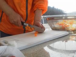 | 仕込み。今回はすべて現地で。みんな、何かやってるなぁって寄ってきやすいかと。おしながき、作成中。あんな字が書けたらいいなぁ。 |
