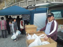 途中、買出しをしながら向かいます。今回、配る野菜と焼き鳥は富山。炊き出し材料は高田。支援品は小松。焼き肉は仙台仏青です。