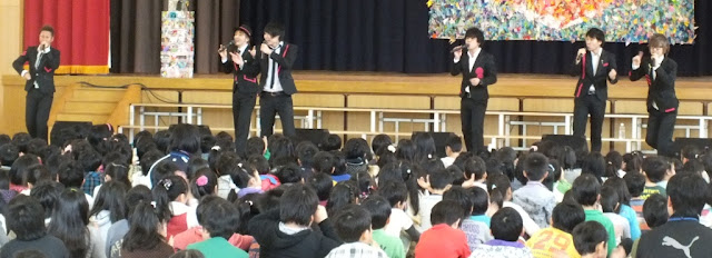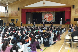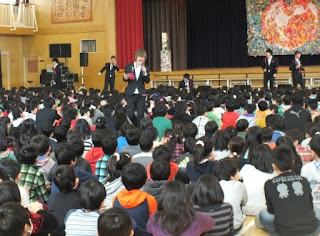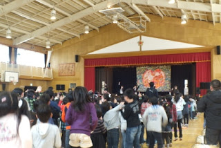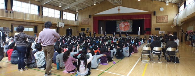 午前中の小学校。ボイスパーカッションのNARUの紹介で、みんな相当驚いてたし、小学生のくいつきはすごかった。