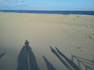 今年の3/ 11に浜にたった観音さん。亡くなった人たち名が刻まれ た石碑も。浜から見た海。