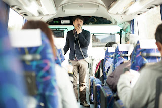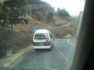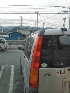 お迎えです。雄勝方面のバス、もう着いてました。浜の皆さんと挨拶して、僕が担当の牡鹿半島へ移動です。